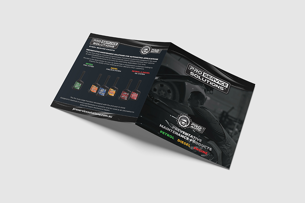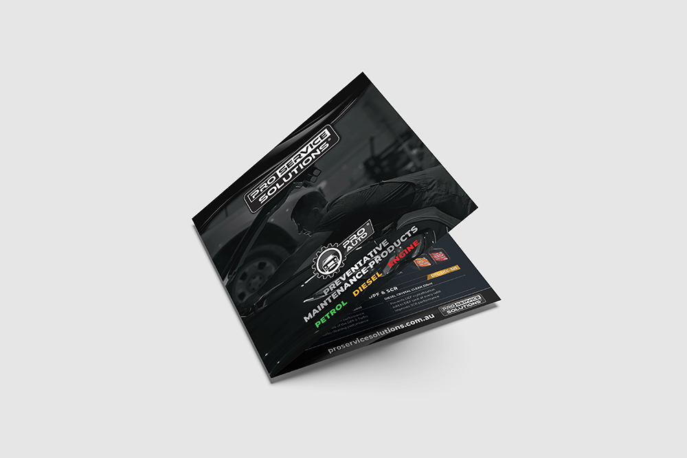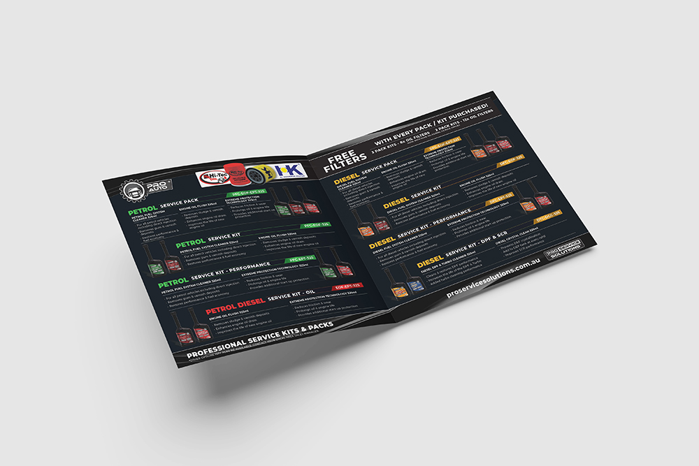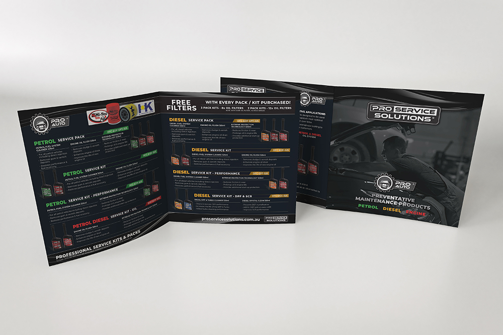 Pro Service Solutions offers a wide range of service kits — thoughtfully grouped products designed to work seamlessly together in a workshop environment. The challenge was to present these kits in a way that felt clear, premium and unmistakably aligned with the brand’s upmarket position. A standard A4 brochure didn’t feel right; it’s what everyone else does, and Pro Service Solutions has never aimed to blend in.