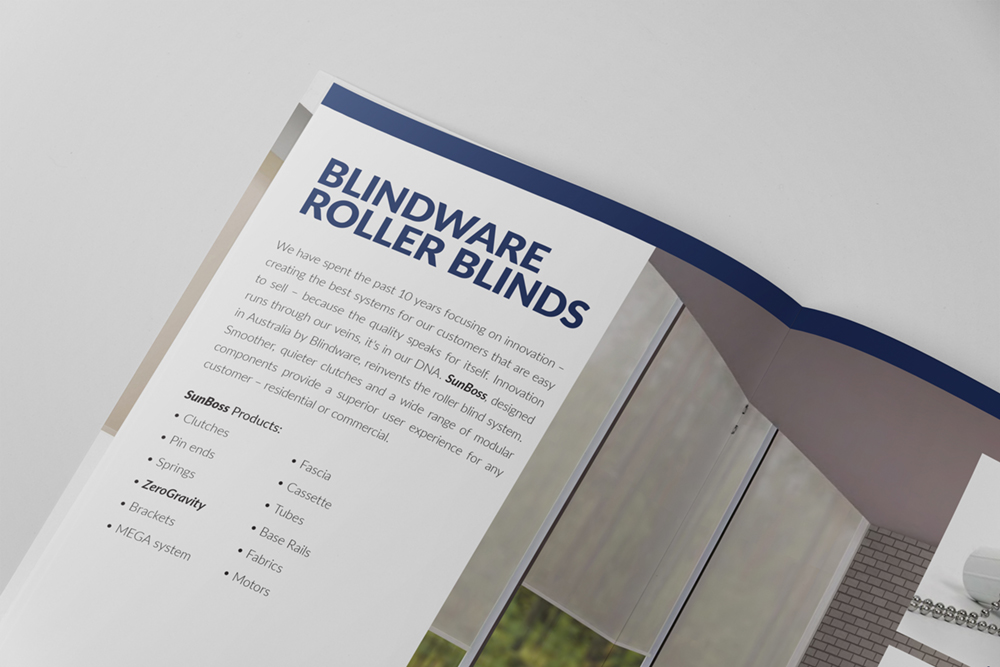 Blindware approached us with a specific requirement: a comprehensive brochure that would effectively showcase their entire product range, including their sub-brands, namely ZeroGravity, SunBoss, and Motolux. Our task was to create a cohesive and user-friendly catalogue that would provide a clear overview of their offerings.